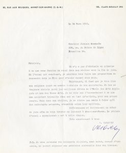 Ensemble de 4 lettres tapuscrites signées, adressées à l'artiste belge Jacques Weemaels, alors âgé de 23 ans. Ces lettres, datées 1966 et 1967 à en-tête de son adresse à Annet-sur-Marne, font suite à la demande de Weemaels de pouvoir travailler pour Vasarely. Ce dernier lui explique son exigence envers ses assistants : "Je les ai toujours choisis parmi les meilleurs élèves de l'Ecole des Arts appliqués et non des Beaux Arts. Je ne vois pas l'inconvénient à ce que mon assistant travaille chez moi en tant qu'artiste, pour son propre compte. Mais dans mon atelier, je ne désire pas avoir à faire qu'à des exécutants salariés, rémunérés selon leur aptitude". On joint le brouillon des lettres de Weemaels adressées à Vasarely. Jacques Weemaels (Bruxelles, °1943) est un peintre, aquarelliste et céramiste belge. Il suit une formation en architecture et sculpture à l'Académie et à La Cambre à Bruxelles. Style abstrait.