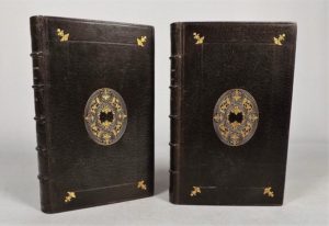 SOMAIZE (Antoine Beaudeau, sieur de). Le Dictionnaire des Précieuses. Paris, Jannet, 1856. 2 volumes in-12, maroquin anthracite, plats ornés d'un médaillon central et de fleurons dorés, dentelle intérieure, dos à nerfs ornés, tranches dorées (reliure de l'époque). La préface est une véritable histoire de la préciosité en France ; elle livre les recherches documentées de Livet sur l'influence exercée au XVII° siècle par les femmes et en particulier par l'Hôtel de Rambouillet : Ces femmes reçurent le nom de Précieuses. Très bel exemplaire.