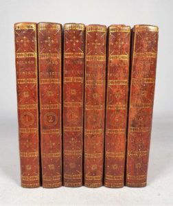 TRESSAN (Louis-Elisabeth de la Vergne de). Roland furieux. Poëme héroïque de l'Arioste. Paris, Dufart, An 5 ou 1796. 6 volumes in-8, maroquin vieux rouge, roulette dorée encadrant les plats, dos lisse orné, tranches dorés (reliure de l'époque). Illustré de 11 belles figures hors-texte. Taches sombres sur les plats. Provenance : Bibliothèque Hugh Greenfield Doggett (tampon ex-libris).