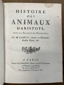 ARISTOTE. Histoire des animaux. A Paris, chez la Veuve Desaint, 1783. 2 vol. in-4, [4] f., LVI-758 …