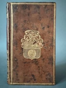 [Reliure aux armes]. [ARNAULD (Antoine)]. Le franc et véritable discours au roi, sur le rétablissement qui luy est demandé pour les jésuites. S.l., s.n., 1603. In-12, 144 p., veau raciné havane XVIIIe s., dos lisse, pièce de titre basane brune en long, fleurons rayonnants dorés, armes au paon rouant sous couronne baron, postérieures, dorées au centre des plats dans un triple d'encadrement (épidermures touchant les armes centrales ; lég. déchirures aux p. 81-84 en marge sans atteinte au texte). Annotation ancienne à l'encre brune au f. lim.