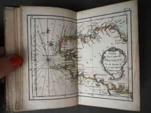 LA FICHE DÉFINITIVE SERA PUBLIÉE DÉBUT SEPTEMBRE /// BONNE (Rigobert). Atlas maritime ou cartes réduites de toutes les côtes de France, avec des cartes particulières des isles voisines les plus considérables, suivies des plans des principales villes maritimes de ce royaume. Paris, Lattré, [1762]. Petit in-12, veau havane raciné, dos lisse, pièce de titre rouge, fleurons dorés, tranches rouges (coiffes arrachées, rel. frottée, 3 coins émoussés, charnières intérieures découvertes ; mouillure claire en queue du volume)