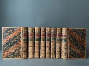 BRANTÔME (Pierre de Bourdeille de). Oeuvres du seigneur de Brantôme. Nouvelle édition plus correcte que les précédentes. A Paris, chez J.-F. Bastien, 1787. 8 volumes in-8, veau fauve veiné de l'époque, dos à 5 nerfs, pièces de titre et de tomaison rouges et vertes, caissons ornés, triple filet doré bordant les plats, tranches marbrées (une coiffe et des coins frottés, petit trav. de ver en queue d'un dos ; brunissures). Edition illustrée d'un portrait de l'auteur en frontispice et comprenant 8 tableaux généalogiques dont 7 hors-texte. Etiquette ancienne du libraire Chappuis de Bordeaux. Agréable exemplaire dans une reliure soignée du temps.