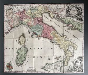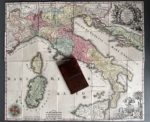 [Carte géographique]. [Italie]. CANTELLI (Giacomo). L'Italia con le sue poste e strade principali descritta. Augsbourg, M. Seutter, [vers 1720 ?]. Une carte gravée sur cuivre, 48,8 x 56,8 cm., coloriée, entoilée, pliée sous étui in-12 en basane brune de l'époque, portant sur une face le titre à froid « Post. Carten von Italien » (défauts aux bords de l'étui, reteinté). Belle carte d'Italie publiée initialement par Domenico de Rossi à Rome entre 1684 et 1697, dans l'atlas « Mercurio Geografico ». Copie germanique, agrémentée de cartouches ornementaux dont un signé du graveur E. Bäck a Held. (?). La carte couvre l'Italie à l'exception de la partie sud de la Sicile, et contient également les côtes de Dalmatie, la Corse et la Sardaigne.