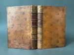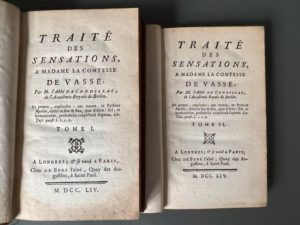 CONDILLAC (Etienne Bonnot de). Traité des sensations, à Madame la comtesse de Vassé. A Londres, et se vend à Paris, chez de Bure l'aîné, 1754. 2 volumes in-12, [1] f., VI-345 p. + [2] f., 335 p., basane fauve époque, dos à 5 nerfs, pièces de titre et de tomaison brunes, caissons ornés, tranches rouges (qq. frott., accrocs à 3 coiffes, un plat inf. un peu déformé par une mouillure prolongée dans les marges de pied, plus soutenue à la fin du t.1). Edition originale. (Garrison & Morton 4968 ; Tchemerzine II, 479 ; En français dans le texte, 158 ; INED 1165).