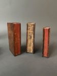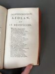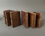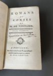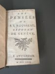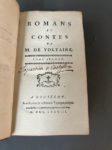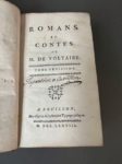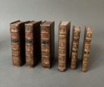 DIDEROT. La religieuse. Paris, Gueffier jeune & Knapen fils, 1796. 2 vol. in-18, [2] f., VIII-247 p. + [2] f., 244 p., fr., basane havane mouchetée époque, dos lisse orné, pièce de titre, tomaison dorée, tranches rouges, coins et mors restaurés (rousseurs, mouillure sur la page de titre et le front. du tome 2). Édition illustrée de 2 frontispices gravés sur cuivre non signés. On joint : - VOLTAIRE. Romans et contes de M. de Voltaire. A Bouillon, aux dépens de la Société typographique, 1778. 3 vol in-12, basane brune mouchetée époque, dos à 5 nerfs, pièces de titre et tomaison, tranches rouges (rel. frottée, des coiffes découvertes ; qq. salissures). Signature ancienne répétée aux titres, Castillon ; ex-libris gravé moderne, Debièvre. - ROUSSEAU (Jean-Jacques). Les pensées... A Amsterdam, s.n, 1763. In-12, XII-336 p. basane écaille époque, dos à 5 nerfs, pièce de titre, caissons ornés, tranches marbrées, restaurations dont aux coiffes et coins. Contrefaçon hollandaise paru la même année que l'édition originale de Paris. Signature ancienne en tête du titre "Bertrand Châtillon". Soit 3 ouvrages en 6 volumes.