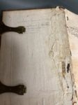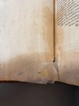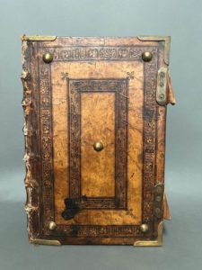 [Livre du XVIe s.]. ÉRASME. Des. Erasmi Rot. Operum tertius tomus epistolas complectens universas... Basileae, ex. off. Frobeniana, 1540 [au colophon : ... et N. Episcopium, 1538]. Fort in-folio, [6] f., 1213 p., [1] f., veau havane époque, sur ais de bois, dos à 6 nerfs, pièce de titre fauve, plats ornés à froid d'un double cadre de roulettes, dont une avec portraits en médaillons, avec filets et fleurons angulaires, boulons et ombilics, coins et fermoirs de cuivre, mention et titre et de possesseur dorés au plat inférieur (défauts dont coiffes et mors sup. grossièrement restaurés, couvrure fendue au plat inf. le long du mors ; fermoirs sans doute rapportés ou du moins déplacés ; titre défraîchi, mouillure en pied de pages, soutenue en début de vol. avec lacunes en marge du titre, puis s'atténuant ; taches d'encre p.660-661 et 849). Première édition d'oeuvres complètes d'Erasme. C'est ici le troisième tome, consacré à la correspondance, l'édition complète étant composée de 9 volumes. Marque de Froben gravée sur bois au titre et au v° du dernier feuillet. Quelques soulignements et repères de lecture anciens. Provenance : « F. Henricus Mauroy » (supra-libris doré de l'époque ; désigne peut-être Henri Mauroy, théologien franciscain de Troyes). (VD16 E1864 ; USTC 635468).
