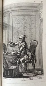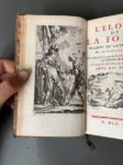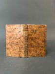 ÉRASME. L'éloge de la folie, traduit du latin... par M. Gueudeville. Nouvelle édition revûe & corrigée sur le texte de l'édition de Bâle. S.l., s.n. 1751. In-12, [1] f. (titre), XXIV-222 p., [3] f. (explication des figures, table)], front., pl., veau fauve marbré époque, dos à 5 nerfs, pièce de titre blonde, roulette dorée aux coupes, tranches jaspées (dos frotté). Charmante édition donnée par Meunier de Querlon et illustrée d'un frontispice, de 3 vignettes (une au titre, une en tête du texte et une en fin de volume), et de 13 planches, le tout gravé sur cuivre d'après Eisen. (Cohen, 348, avec quelques variantes, notamment, la vignette de titre est ici signée par Eisen et Le Mire).