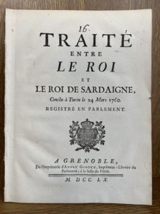[Italie]. Traité entre le Roi et le Roi de Sardaigne, conclu à Turin le 24 mars 1760, registré en Parlement. A Grenoble, de l'Imp. d'André Giroud, 1760. In-4, 44 p., broché, sans couverture. Édition publiée à la même date que l'originale, à Paris, à l'Imprimerie royale. Premier traité délimitant les frontières entre le royaume de France et celui de Piémont-Sardaigne.
