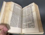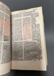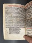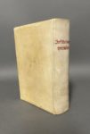 [Livre du XVIe s.]. JUSTINIEN Ier. Institutio[n]es i[m]periales... Lugduni, per Gilbertum Devilliers, 1526. In-8, [23 (sur 24)] f., [385] (sur 388) f., parchemin ivoire récent, dos lisse, titre peint en rouge (mouillures sur l'ens. du vol. mais sans gravité, titre un peu frotté avec marges remplacées, piqûre de ver en marge du début jusqu'au f.172, et sur le texte touchant une ou 2 lettre à chaque page du f. 103 jusqu'à la fin ; manquent un f. limin. et les f. B7, B8 et Z4). Édition lyonnaise soignée d'après le texte établi par Jean Chappuis. Impression en rouge et noir sur 2 colonnes, le titre typographié orné d'une vignette et dans un cadre ornemental, le tout gravé sur bois. Sign. [croix]8 (sauf 2), A8, B7 (sur 8), a-z8, &8 [con]8 [rum]9 A8, B6 (sur8), C-Y8, Z3 (sur 4). (USTC 145778).
