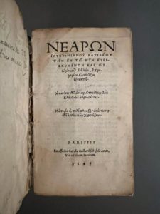 [Livre du XVIe s.]. JUSTINIEN Ier. [En grec] Nearōn Joustinianou basileōs tōn en tō nyn …