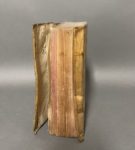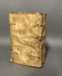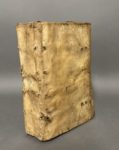 [Livre du XVIe s.]. JUSTINIEN Ier. [En grec] Nearōn Joustinianou basileōs tōn en tō nyn heuriskomenōn kai hōs heuriskontai biblio... Parisiis, ex off. C. Guillard, 1542. In-8, [16]-446 f., [2] f. blancs [sign. alpha-bêta 8, a-Z 8, Z-Z 8, A-KK 8], parchemin ivoire ancien, recouvrements, dos lisse et muet (rel. frottée, plats gondolés, lacets absents, petites lac. de couvrure au dos, garde sup. manquante ; un coin mq. en marge du 2e f., mouillure au titre, découpé en marge de tête sur 1 cm, mouillures claires en pied de pages, rouss.). Edition soignée des Novelles de Justinien, en grec, issue des presses de la libraire et imprimeure parisienne Charlotte Guillard. Le texte est établi d'après les travaux d'Andrea Alciati et de Gregor Haloander. Initiales gravées sur bois. (BP16, 110642).