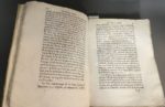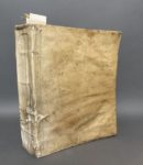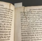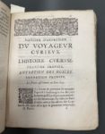 [LE BLANC (Vincent)]. Le voyageur curieux qui fait le tour du monde. Avec ses matières d'entretien qui composent l'Histoire curieuse. Par le Sr. de B. A Paris, chez F. Clousier, 1664. Trois parties en un volume in-4, [8] f., 424 p. en continu ; 360 p., velin ivoire époque (reliure remontée et réparée, gardes renouvelées, titre défraîchi et réparé, cahiers déréglés, défauts int. dont trav. de vers p.170-180 et qq. mouillures). Unique édition de cet ouvrage que l'on trouve le plus souvent attribué à Vincent Le Blanc (1554 -v. 1640), explorateur français originaire de Marseille, mais qui semble relever d'une compilation organisée par l'éditeur Clousier. Elle ne figurait pas dans la bibliothèque Chadenat. La première partie du volume (jusqu'à la p.253) décrit toutes sortes de lieux d'Europe du nord et de l'est, Afrique et Asie, et mentionne les rivages de l'Amérique, sous le prétexte d'un voyage « autour du monde » ; la seconde (jusqu'à la p.424) rapporte des anecdotes variées de « philosophie curieuse » sur les quatre éléments et l'homme ; la troisième formant la moitié du volume est un recueil d'anecdotes historiques.