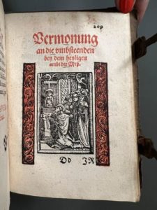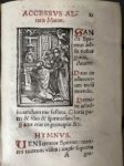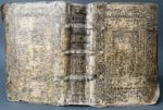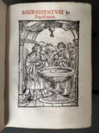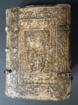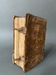[Livre du XVIe siècle]. [Liturgie, Salzbourg]. LIBELLUS agendarum, circa sacramenta, benedictiones, & cæremonias, secundum antiquum usum Metropolitanæ Ecclesiæ Salisburgensis. Salisburgi, J. Bauman, 1557. In-8, [8]-240 f., peau de truie estampée sur ais de bois époque, dos à 3 nerfs, titre à manuscrit, plats décorés à froid d'une figure allégorique central bordée d'une roulette, fermoirs (rel. frottée, 3 coins usés, piq. de vers au dos ; salissures, traces digitales, mq. de papier en marge fol.26, 108 et 226, dernier f. réparé en marge). Rare ouvrage liturgique à l'usage de l'Église métropolitaine de Salzbourg, en partie en latin et en partie en allemand. Première édition, dont deux tirages ont été exécutés la même année. Imprimé en rouge et noir, titre illustré d'une grande vignette aux armes, dont celles de Salzbourg, 17 figures dans le texte, certaines répétées, dont 2 à pleine page, le tout gravé sur bois. Provenance : mention manuscrite au contreplat sup. d'un prix fondé par un certain comte Joannis Philippi de Hoyos en 1726 ; suite d'initiales manuscrites au contreplat inf. datées 1575. (USTC 672666 ou 667).