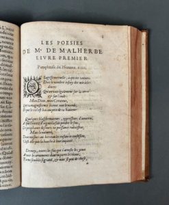 MALHERBE (François de). Les oeuvres... Troisième édition. A Paris, chez A. de Sommaville, 1638. Deux parties en un volume in-4, [12] f., 226-228 p., veau blond époque, dos à 5 nerfs, caissons ornés, pièce de titre rouge peut-être renouvelée, double filet doré bordant les plats, tranches rouges (défauts dont taches et griffures aux plats, accroc à la coiffe de tête ; f. Ff1 et Ff2 courts de marges ; sans le portrait).