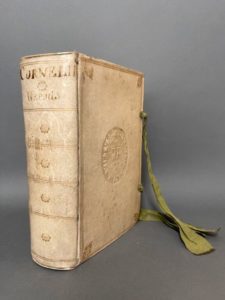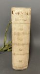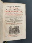NEPOS (Cornelius). Vitae excellentium imperatorum, cum integris Notis Jani Gebhardi, Henr. Ernstii, & Jo. Andreae Bosii... Curante Augustino van Staveren. Lugd. batavorum, apud S. Luchtmans, 1734. In-8, [16] f. (dont le titre gravé), 765 p., [93] f. (index), velin blanc époque, dos lisse, titre à l'encre, filets et fleurons dorés, triple filet, fleurons angulaires et médaillon central aux armes orant les plats, le tout doré, lacets de satin vert (dorure un peu passée au plat sup. ; rouss. et bruniss. modérées). Édition érudite, illustrée d'un frontispice allégorique gravé sur cuivre par J. Vischer, et de 12 vignettes dans le texte, en particulier des portraits. Exemplaire de prix aux armes de la ville d'Haarlem, avec la devise « Vicit vim virtus ».
