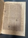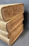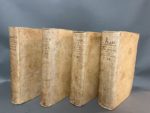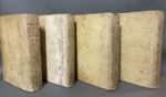 [Livre du XVIe s.]. [Bible. Latin. 1528]. NICOLAS DE LYRE. Hoc in aureo opere optimo cuique lectori apprime necessario haec sequentia continentur : videlicet, Textus Bibliae cum glossa ordinaria, Nicolai de Lyra Postilla, Moralitatibus ejusdem, Pauli Burgensis, Additionibus Matthiae Thoring Replicis. [Au colophon] : Lugduni impressa in aedibus Iacobis Mareschal, 1528. 4 (sur 7) volumes in-folio, 377 + 315 + 440 + 479-[1] f., velin XVIIIe s., dos lisse, titre à l'encre aux dos, titre manuscrit ancien à l'encre sur les tranches (menus défauts d'usage et petits accrocs aux rel. ; des ff. brunis, rousseurs, qq. mouill. en marge, plus étendues dans les marges de pied du t.4 ; trav. de vers sporadiques, touchant qq. lettres au t.1, au t.3 et en fin de t.2). Tomes I, II, III et IV de cette édition de la Vulgate comprenant les « Postillae » et les « Moralia » de Nicolas de Lyre, les « Additiones » de Paul de Sainte-Marie et les « Replicationes » de Mathias Döring. Elle reprend l'édition de 1520 publiée par le même libraire, celle-ci suivant l'édition de Bâle, Froben, 1506-1508. Texte en caractères romains, sur une colonne centrale avec la glose de chaque côté, initiales gravées sur bois. Chaque page de titre est illustrée d'une vignette et d'un encadrement gravés sur bois répétés ; quelques figures gravées sur bois dans le texte. (Bibles, Paris, 817 ; Adams B1010).