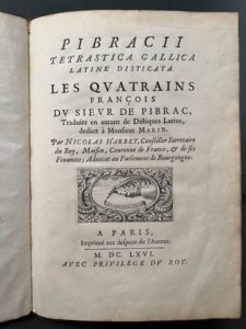 PIBRAC (Guy Du Faur de). Pibracii Tetrastica gallica, latine disticata. Les Quatrains françois du sieur de Pibrac, traduits en autant de distiques latins... par Nicolas Harbet... A Paris, imprimé aux despens de l'auteur, 1666. In-4, [4] f., 53 p., veau havane époque, dos à 4 nerfs orné, plats ornés à la Duseuil, roulette dorée aux coupes (rel. frottée, coins et coiffes usés, plats épid. ; qq. bruniss, petites taches p.14-15 ; sans le portrait gravé du dédicataire). Texte latin et traduction française en regard. Vignette gravée sur cuivre au titre. Annotations anciennes sur une garde.
