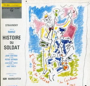 Histoire du soldat. Musique d'Igor Stravinsky. Voix de Jean Cocteau, Peter Ustinov, J.-M. Fertey et A. Tonietti. S.l., Philips, s.d., 1 disque 33 tours, sous pochette illustrée par Cocteau./ SARTRE (Jean-Paul). Huis-clos. Pièce en 1 acte présenté par l'auteur. S.l., Deutsche Grammophon, s.d., 2 disques 33 tours, sous pochette illustrée./ GUITRY (Sacha). Le Mot de Cambronne. Comédie en 1 acte. P., Marconi, s.d., 1 disque 33 tours, sous pochette illustrée d'une photo de l'auteur./ Louis Jouvet joue Jean Giraudoux. S.l., Adès, ORTF, "Florilège", s.d., 1 disque 33 1/3 tours, sous pochette illustrée./ ACHARD (Marcel). Discours sous la Coupole. Réception à l'Académie française. Lausanne, La Voix de l'auteur, s.d., 1 disque 33 tours, sous pochette illustrée. Etats divers./ Ens. 5 pièces.