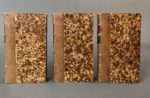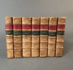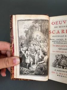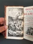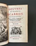 SCARRON (Paul). OEuvres... Nouvelle édition. Revue, corrigée, augmentée de l'Histoire de sa Vie de ses Ouvrages, d'un Discours sur le Style Burlesque, de quantité de Pièces omises dans les Editions précédentes. A Amsterdam, chez J. Wetstein, 1752. 7 volumes in-16, demi-veau fauve glacé XIXe s., dos à 5 nerfs, pièces de titre et de tomaison rouges et vertes, fleurons dorés, tranches dorées (dos un peu passés, petites auréoles dans qq. marges de pied du t.2, rares rousseurs). Edition illustrée du portrait gravé non signé de l'auteur en tête du premier volume et de 6 frontispices gravés par Folkema, dont 5 d'après Dubourg. (Cohen 945-946).