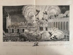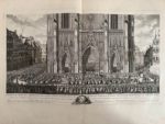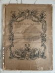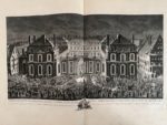 WEIS (Jean-Martin). Représentation des fêtes données par la ville de Strasbourg pour la convalescence du Roi ; à l'arrivée et pendant le séjour de Sa Majesté en cette ville. Imprimé par Laurent Aubert à Paris, [1744]. Grand in-folio, broché (couv. lacunaire, traces de papier adhésif au portrait-frontispice et à p. 20, rousseurs claires, mouillure claire aux derniers f.). Entièrement gravé, il se compose de : un titre dans un cartouche rocaille, gravé par M. Marvye, la lettre par Le Parmentier ; le portrait équestre de Louis XV, gravé par Johann Georg Wille d'après Charles Parrocel ; 11 planches doubles des vues et scènes gravées par Jacques Philippe Le Bas, d'après les compositions de Jean-Martin Weis, montrant l'arrivée du Roi, l'entrée à Strasbourg, le cortège, les décorations et illuminations des monuments, le feu d'artifice, etc. ; 20 pages de texte, dans un encadrement, et illustrées de 2 grandes vignettes gravées par Marvye.