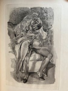 [BALLIVET]. Initiation amoureuse. Avec des illustrations originales par une artiste célèbre. A Buenos-Ayres, Pour les amis de l'artiste, 1943. [Paris, Georges Guillot, vers 1950]. In-4, demi-chagrin orange, dos à 5 nerfs, titre dorée, filets à froid, filet à froid aux plats, tête dorée, couv. conservée, non rogné. Illustré de 25 compositions de Suzanne Ballivet : 10 planches en noir et 15 gravures en couleurs in-texte. Tirage limité à 200 exemplaires, celui-ci sur papier vélin BFK de Rive, sans le feuillet de justification.