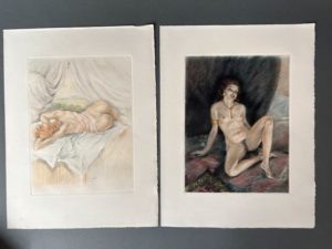 CHIMOT. BAUDELAIRE (Charles). Les fleurs du mal. Paris, Georges Briffaut, 1941. In-4, en feuilles, couv. rempliée, chemise et étui éditeur (lég. rouss. au repli de la couv. et infimes dans qq. marges). Illustré de 25 eaux-fortes en couleurs, d'après les compositions d'Édouard Chimot. Tirage limité à 500 exemplaires : un des 474 sur vélin d'Arches (n° 378), enrichi des 5 planches refusées en couleurs.