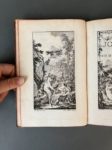 [Curiosa]. [JOUFFREAU DE LAGERIE (abbé)]. Le joujou des demoiselles. S.l., s.n., [v. 1750]. In-8, [59] f. (dont titre et front.) imprimés au recto seul, fig., veau fauve époque, dos à 5 nerfs, pièce de titre rouge, caissons ornés, filet doré aux coupes, tranches rouge (frott. superf. aux coupes et coins, piq. de ver négligeable sur un mors). Recueil de contes, anecdotes et épigrammes licencieux, entièrement gravé, composé d'un frontispice et d'un titre-frontispice gravés par Ch. Eisen d'après N. Le Mire, et de 57 vignettes non signées - une en tête de chaque feuillet - offrant des scènes bucoliques ou champêtres ou des personnages en groupes, certaines répétées. Cohen (521-522) et Pia (col. 700) ne signalent respectivement que 55 et 56 figures. Étiquette ex-libris armoriée gravée du chevalier Isambart-Nicolas de Busquet, XVIIIe s.