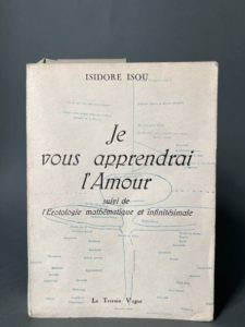 ISOU (Isidore). Je vous apprendrai l'amour. Suivi de l'Erotologie mathématique et infinitésimale. Paris, Le Terrain vague, 1957. In-8, 501 p., pl., broché (p. 369 à la fin sur papier bleu). Édition originale. Complet de la planche volante dépliante, La Carte isouienne du Passionnel ; et d'une partie de son bandeau : "Si vous ne deviez lire qu'un seul livre érotique dans votre vie, lisez celui-ci qui les explique et les dépasse tous ! ». Exemplaire non coupé.