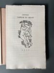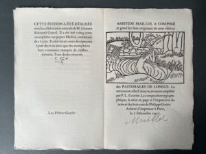 LONGUS. Les pastorales de Longus ou Daphnis & Chloé. Paris, Philippe Gonin, 1937. In-8, en feuilles, chemise demi-vélin et étui bordé éditeur (qq. piq. à l'étui et au dos de la chemise). 48 bois originaux d'Aristide Maillol, dans le texte, dont un sur le titre et un sur la couverture. Traduction d'Amyot, revue et complétée par Paul Louis Courier. Tirage limité à 500 exemplaires sur papier Maillol numérotés et qq. ex. hors commerce : un des hors commerce marqué de chiffres romains (n° CCCV). Notre exemplaire est signé par Aristide Maillol, à la mine de plomb, et est enrichi d'une suite de 22 planches en noir. Provenance : étiquette ex-libris Jacques Crépineau.