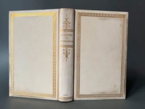 LOUŸS (Pierre). Aphrodite. Moeurs antiques. Paris, Mercure de France, 1896. In-12, parchemin blanc à la bradel, auteur, titre et date dorés, frises de grecques et volutes dorées, encadrement d'une frise de grecques aux plats, couv. et dos conservés, étui [Durvand] (étui frotté et lég. fendu, parchemin frotté et noirci). Édition originale. Exemplaire sur papier courant. Provenance : étiquette ex-libris J.L.R.