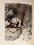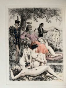 BÉCAT. LOUYS (Pierre). Les aventures du roi Pausole. Paris, Le Vasseur et Cie, 1947. In-4, chagrin bleu nuit, dos lisse, auteur, titre, date et fleurons dorés, filet d'encadrement aux plats, tête dorée, couv. et dos conservés. Édition illustrée de 15 eaux-fortes en couleurs de Paul-Emile Bécat dont 6 hors-texte. Tirage à 540 exemplaires : un des 400 sur vélin Lafuma, numéroté 167.