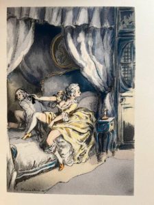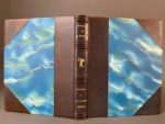 TOUCHET. RÉTIF DE LA BRETONNE (Nicolas Edme). Le paysan & la paysanne pervertis. Paris, Editions du Mouflon, 1948. In-4, demi-chagrin bleu-gris poli à coins, dos à 16 nerfs, auteur et titre dorés, Éros en fleurons dorés, tête dorée, couv. et dos conservés, non rogné (coins lég. insolés). 24 illustrations en couleurs de Jacques Touchet, dont 12 planches et 12 in-texte. Tirage limité à 588 exemplaires : un des 450 sur vélin teinté du Marais (n°146).