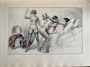 [ROJAN]. S… (Wanda de). Françoise ou Les plaisirs du mariage. [Paris], Aux allées des roses, [vers 1935]. In-8, broché, couv. rempliée (couv. défraîchie avec petits accrocs). Édition originale d'un roman pornographique clandestin. 10 planches lithographiées en couleurs attribuées à Rojan (pseud. de Fiodor Stepanovich Rojankovski, 1891-1970). Tirage limité à 600 exemplaires : un des 500 sur vélin (n°456). (Dutel 1605).