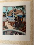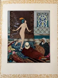 CARRÉ. TOUSSAINT (Franz). Le jardin des caresses. Traduit de l'arabe. Paris, Piazza, 1914. In-4 carré, broché, couv. illustrée rempliée. 10 planches de Léon Carré, coloriées et dorées au pochoir sous serpente légendée. Le texte est accompagné d'ornements en deux tons.