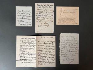 PEINTRES PUVIS DE CHAVANNES de Pierre (1824-1898) 4 L.A.S. à M. [Marcel Paul] Meys Paris, 24 mai [1882] et (s.l.n.d.). Une lettre au crayon. Correspondance amicale dans laquelle il soutient son confrère dans son travail « Ne vous laissez pas abattre, l'heure sonne toujours pour les gens bien trempés […] » ; WILLETTE Adolphe (1857-1926) C.A.S. Château de Roissy (s.l. [6 mai 1919]). 1 p. in-12 oblong. En-tête gravé à son adresse. Beau dessin à l'encre dans le coin supérieur gauche. Il remercie d'un poème « […] de l'exquise poésie que vous m'avez envoyée, en réponse à mon trop misérable autographe […] ».