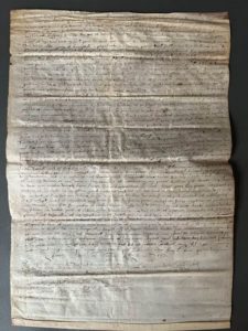 REGIONALISME - GERS Acte de vente sur parchemin, Sarrant, 8 septembre 1614. 1 p. gd in-folio (28x40 cm). Peyronne de Clanenx, veuve de feu Jean Castaing et Jean Castaing, tailleur, mère et fils habitant de la ville de Sarrant, vendent à autre Jean Castaing une pièce de pré et plusieurs pièces de terre labourable assises en la juridiction dudit Sarrant, moyennant le prix de 283 livres tournois.