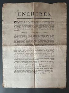 REGIONALISME - VENTABREN Grande affiche 1771 indication manuscrite, 1 p. gd in-folio (31x4I cm). Placard annonçant la vente aux enchères de la Terre et Seigneurie de VENTABREN de la succession de "Pierre Laurens-Joseph de Gaillard de Longjumeau, vivant, conseiller du Roi en la Cour des Comptes Aides et Finances au Parlement de Provence", suit la liste des biens à la vente ainsi que leurs prix estimatifs.