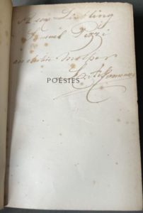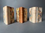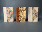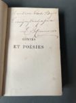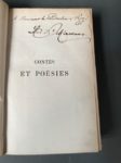 ACKERMANN (Louise). Ensemble de 3 ouvrages : - Contes et Poésies. Paris, Hachette, 1863. In-12, [2] f., 299 p., 8 p. (catalogue), demi-chagrin havane moucheté XXe s., dos lisse, auteur et titre doré, couv. conservée (rousseurs). Edition en partie originale. Envoi autographe signé de l'auteur "À Madame Charles Bigot témoignage de sympathie". - Contes et poésies. Paris, Hachette, 1863. In-12, [2] f., 299 p., demi-vélin à coins époque, dos lisse, auteur, titre, date et initiales frappées en noir. Edition en partie originale. Envoi autographe signé de l'auteur "À Monsieur le docteur Pozzi" : Samuel Pozzi, médecin du Tout-Paris de la Belle-Epoque et familier des compagnies littéraires et féminines. Ses initiales figurent frappée au dos de la reliure. - Poésies. Paris, Alphonse Lemerre, 1877. In-12, [2] f., 160 p., [2] f. (dont 1 bl.), demi-vélin à coins époque, dos lisse, auteur, titre et date frappées en noir (rousseurs). Envoi autographe signé de l'auteur au docteur Pozzi au faux-titre .