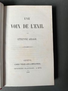 ARAGO (Etienne). Une voix de l'exil. Genève, Imprimerie Blanchard, 1860. In-12 [2] f., 294 p., …