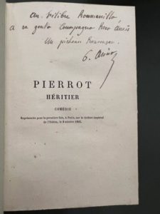 ARÈNE (Paul). Ensemble de 3 ouvrages, in-12, reliures similaires modernes demi-maroquin fauve à coins, dos à 5 nerfs, auteur, titre et date dorés, filet doré aux plats, tête dorée. - Pierrot héritier, comédie en un acte en vers. Paris, Michel Lévy, 1866. [2] f., 32 p. Edition originale. Envoi autographe signé de l'auteur à Joseph Roumanille, célèbre auteur provençal " Au Félibre Roumanillo, / A sa gento Coumpagno Roso Anaïs / Un pichoun Prouvençau. / P. Aréno". - Vingt jours en Tunisie. Paris, Alphonse Lemerre, 1884. [1] f., 297 p. (qq. rousseurs). Edition originale. - Paris ingénu. Paris, G. Charpentier, 1882. In-12, [2] f., 318 p., (légères rousseurs). Edition originale. Envoi au faux-titre "À Charles Monselet / Fraternellement / Paul Arène".