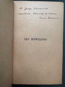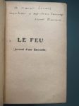 BARBUSSE (Henri). Ensemble de 2 ouvrages. - Les suppliants. Paris, Bibliothèque-Charpentier, 1903. In-12, VI-302 p., rel. récente simili-chagrin gris perle à coins, dos à cinq nerfs, auteur, titre, filets et fleurons dorés, couv. et dos conservés (papier jauni). Edition originale. Envoi de l'auteur sur le faux-titre "À Georges Clémenceau / respectueux hommage de l'auteur / Henri Barbusse". - Le feu (journal d'une escouade). Paris, Flammarion, [1916]. In-12, [2] f., 378 p., [1] f, rel. récente simili-chagrin marine à coins, dos à cinq nerfs, auteur, titre, filets et fleurons dorés, couv. et dos conservés (papier jauni). Edition originale. Envoi de l'auteur sur le faux-titre "À Marcelle Israël / respectueux et affectueux hommage / Henri Barbusse".