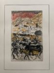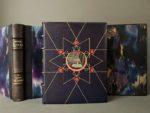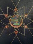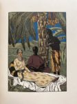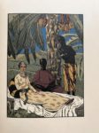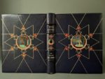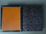 SURÉDA. BARRÈS (Maurice). Un jardin sur l'Oronte. Paris, Javal & Bourdeaux, 1927. In-4, maroquin bleu marine, dos à 4 nerfs saillants, auteur, titre et date dorés, caisson central orné d'un croissant et d'étoiles à six branches mosaïqués, les plats mosaïqués à décor d'un médaillon rond central polychrome dans un encadrement de filets dorés dessinant une étoile à six branches, au motif d'une fontaine dans un parc sur le plat sup., d'un palmier sur une balustrade au plat inf., les contreplats doublés de maroquin fauve et bordés de maroquin bleu orné de filets dorés, avec étoiles à six branches en fleurons angulaires, garde recouverte de soierie brodée de dragons dans les nuages, tranches dorées sur témoins, couv. et dos conservés, chemise demi-maroquin assortie, étui bordé [G. Levitsky] (fentes partielles à l'étui, charnière int. de la chemise fendue). Ouvrage illustré de 17 compositions d'André Suréda, dont 16 planches, traduites sur bois par Robert Dill. Le texte et les nombreux ornements (bandeaux, lettrines, motifs et culs-de-lampe) sont imprimés en noir et or. Tirage à 490 exemplaires : un des 20 sur japon impérial (n°18) comprenant une suite des hors-texte et du premier bandeau sur chine, une suite de tous les bois noir et or sur japon impérial, la décomposition d'un hors-texte sur chine, et un des croquis originaux de l'artiste aux crayons en couleurs (16 x 10 cm). Très belle reliure parfaitement exécutée par Gregory Levitzky (1885-1969), originaire d'Ukraine et établi en France où il se distingua comme l'un des meilleurs de son temps.