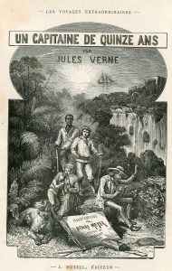 Un capitaine de quinze ans. Dessins par H. Meyer. Gravures par Ch. Barbant. P., Hetzel, s.d., 4°, 376 p., cat. d'édit. in fine, cart. polychrome d'édit., plat supér. à l'éventail et aux 2 éléphants, 2ème plat au médaillon à froid "Collection Hetzel", tranches dorées (ex. gauchi, dos lég. noirci, mouill. au 2e plat , nombr. rouss.) (reliure de A. Lenègre).