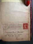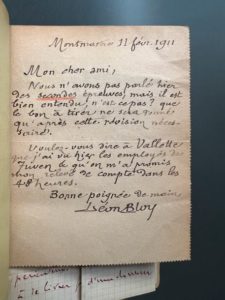 BLOY (Léon). Le vieux de la montagne. Pour faire suite au Mendiant Ingrat à Mon Journal à Quatre Ans de Captivité à Cochons-sur-Marne à l'Invendable. 1907-1910. Paris, Mercure de France, 1911. In-12, demi-basane chagrinée bordeaux, 2 nerfs saillants prolongés en motifs de flèches sur les plats, auteur et titre et filet, couv. et dos conservés, tête dorée (coiffes et nerfs frottés, papier jauni). Édition originale Avec 2 reproductions photographiques. Exemplaire enrichi d'une carte-lettre autographe signée de Léon Bloy à l'attention de Monsieur Paul Morice de la maison d'édition Mercure de France située et datée Montmartre 11 février 1911, à propos de relecture d'épreuves ; et 4 pages in-4° manuscrites concernant Léon Bloy.