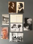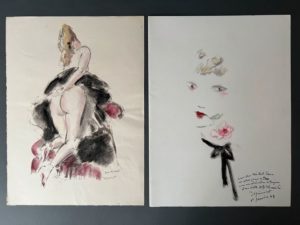 [Michel Simon]. DIGNIMONT. CARCO (Francis). Dignimont. Monte-Carlo, André Sauret, 1946. In-folio, en feuilles, couv. rempliée, chemise et étui éditeur (étui et chemise frottés ; rousseurs aux f. de texte) Frontispice (justifié épreuve d'artiste et signé par Dignimont à la mine de plomb), 16 illustrations in-texte ou à pleine page, et 39 [sur 41] planches en couleurs, sépia ou au trait in fine tirées avec le concours de Fernand Mourlot, Georges Duval, Maurice Beaufumé, Pierre Bricage. Sans justificatif : tirage limité à 410 exemplaires sur vélin de Rives. Exemplaire de Michel Simon enrichi : - d'une aquarelle originale signée de André Dignimont avec envoi daté du 1er janvier [19]47 : "A mon cher Michel Simon au plus grand de tous, avec mon admiration de toujours et ma vieille et fidèle amitié, représentant un portrait de femme à la fleur rose dans la bouche " ; - d'une aquarelle originale signée et dédicacée de André Dignimont "pour Michel" sur feuillet libre représentant le fessier ; - 17 épreuves photographiques représentant Michel Simon en portrait, sur le plateau ou même en famille, de Sasha Masour, Photo Masour, Raymond Voinquel, Studio Max Bruxelles, BM. Bernand, Guy André. Une dédicacée par Michel Simon située et datée 1939. - carte postale autographe signée de Michel Simon à (?) Chère mademoiselle : "notre tour de chant à Montréal a été un très fort succès, ça m'a bien réconforté mais bien fatiguée. Le public québécois est bien le public le plus extraordinaire que j'ai rencontré, vibrant, spirituel. Nous avons passé quinze jours de félicité". - Maison natale de Michel Simon, aquarelle et mine de plomb, signée et datée 67 en bas à droite, 48,5 x 35 cm (signature illisible, restauration en bas à droite notamment au papier adhésif, deux étiquettes collées dans le haut). - Reproduction d'une photographie représentant Margarethe Krieger dans les bras de Michel Simon, signée et datée 30.VI.76 par Margarethe (dernière compagne de Michel Simon) ; photographie de Margarethe Krieger présentant ses oeuvres lors d'une émission télévisée. On y joint : - carte postale au portrait de Annie Philippe, dédicacée et signée par la chanteuse yéyé. - deux photographies-cartes postales des pianistes Yves Nat (portrait par Laure Albin-Guillot) et Alfred Cortot (portrait par Henri Manuel) dédicacées à l'attention de Anne Mayen (actrice de courte carrière avec Jean Renoir et présentatrice de L'heure du thé à Radio-France).