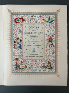 LEMARIÉ. CONTES DES MILLE ET UNE NUITS. Paris, Les Heures Claires, 1955. 3 vol. petit in-4, en feuilles, couv. rempliées, chemises et étuis éditeur (dos des chemises un peu passés). 300 compositions in-texte en couleurs de Henry Lemarié. Tirage limité à 1200 ex. : un des 1040 sur vélin pur fil de Rives (n° 322).