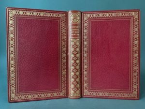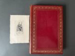ROY, FRAIPONT. DAUDET (Alphonse). Lettres de mon moulin. Paris, Ernest Flammarion, [1904]. In-8, maroquin cerise, dos lisse, auteur et titres dorés, frises de feuilles d'eau dans un encadrement doré, encadrement aux plats de frise de feuilles d'eau, ovales et rond, triple filet et pointillés doré, même encadrement répété aux contreplats, garnitures de soie moirée chocolat ainsi qu'aux gardes, tranches dorées. 150 bois dans le texte par José Roy et G. Fraipont. Ex-libris volant de Gustav Strands Bog, dessiné par Ed. Liesen en 1922 et gravé à l'eau-forte par K.H. en 1923.
