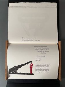 LA ROCCA. GARCIA LORCA (Federico). Le roy de Harlem. [Neuilly], Théâtre typographique, 1984. In-4 oblong, en feuilles, emboitage à rabat illustré, les montants en bois (frottements, insolé, dech. aux mors, petit accroc). Traduction de Guy Lévis Mano et Pierre Darmangeat. 19 bois gravés in-texte en noir et rouge de Valentina La Rocca. Tirage limité à 90 exemplaires numérotés par un tampon gravé de l'artiste (n° 34). Emboîtage conçu par Ng. B. Anh.