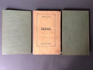 GAUTIER (Théophile). Zigzags. Paris, Victor Magen, 1845. In-8, [2] f., 354 p., [1] f. table, broché, chemise rempliée et étui en percaline vert olive post., étiq. d'auteur et de titre havane à la chemise (dos chemise insolé, dos du broché passé, brochage fatigué, mors inf. lég. déchiré ; rousseurs). Édition originale. Complet de sa table des matières.